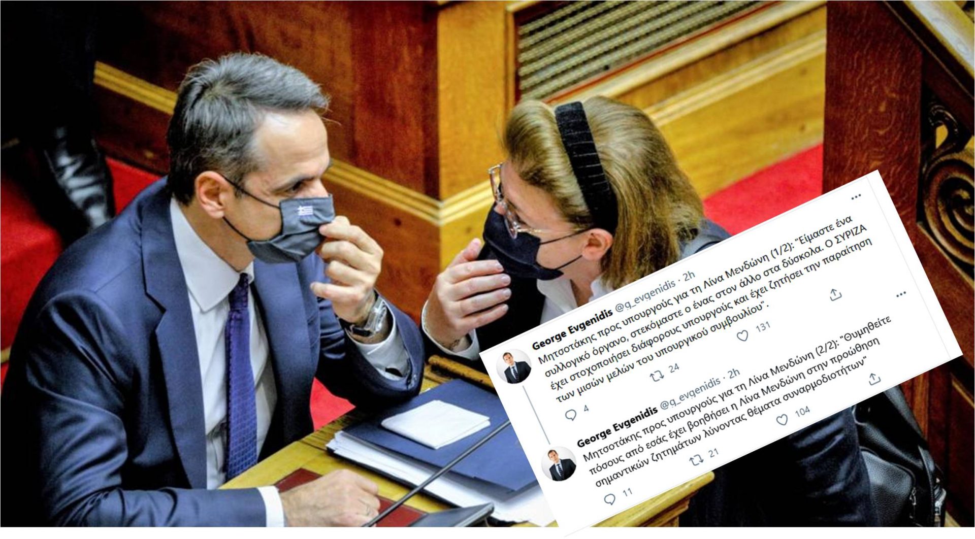 Μητσοτάκης προς υπουργούς για τη Λίνα Μενδώνη : “Είμαστε ένα συλλογικό όργανο, στεκόμαστε ο ένας στον άλλο στα δύσκολα. Ο ΣΥΡΙΖΑ έχει στοχοποιήσει διάφορους υπουργούς και έχει ζητήσει την παραίτηση των μισών μελών του υπουργικού συμβουλίου”.