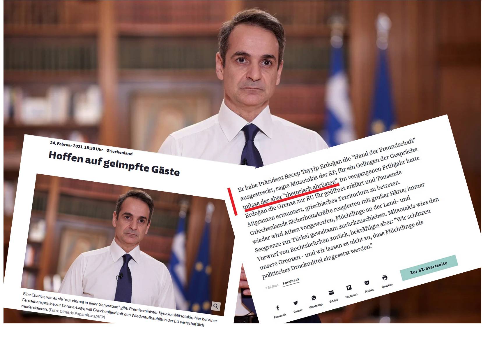 Ο Μητσοτάκης είπε στο SZ ότι είχε τείνει «χέρι φιλίας» στον Πρόεδρο Ρετζέπ Ταγίπ Ερντογάν. Ωστόσο, για να είναι επιτυχημένες οι συνομιλίες, θα πρέπει να «αφοπλιστεί ρητορικά».