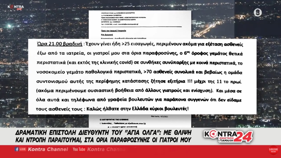 Τη δραματική κατάσταση που επικρατεί στα νοσοκομεία της Αθήνας αποτυπώνει με μελανά γράμματα ο διευθυντής της Παθολογικής του «Αγία Όλγα» λίγες μόλις ώρες μετά τις κυβερνητικές ανακοινώσεις και το «χαλαρό μήνυμα του πρωθυπουργού πως η χώρα μπαίνει στην τελική ευθεία.