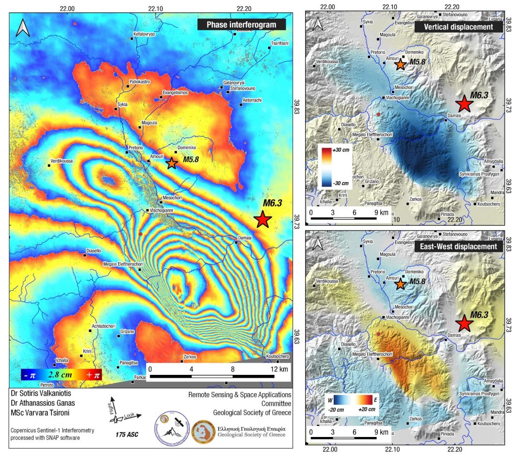 Οι εικόνες (Ιντερφερόγραμμα) απεικονίζουν την παραμόρφωση για τους σεισμούς 6.3 & 5.9 R στη Θεσσαλία, όσο και την μετατόπιση του εδάφους (Οριζόντια & κατακόρυφα)….