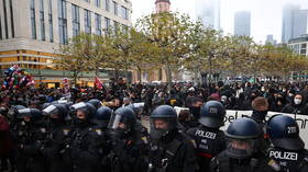Οι αστυνομικοί των ΜΑΤ φρουρούν μετά την επίσημη ακύρωση μιας διαδήλωσης σκεπτικιστών για τον κοροναϊό, καθώς η εξάπλωση του COVID-19 συνεχίζεται στη Φρανκφούρτη της Γερμανίας,
