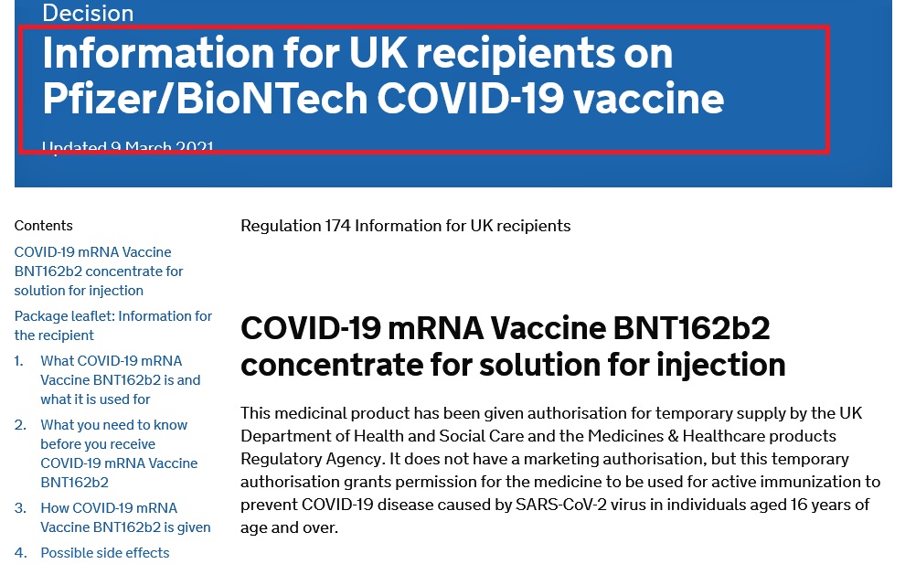 Δείτε τι αναφέρεται σε απόφαση στην επίσημη ιστοσελίδα του Υπουργείου υγείας του Ηνωμένου Βασιλείου σχετικά με το εμβόλιο Pfizer/BioNTech