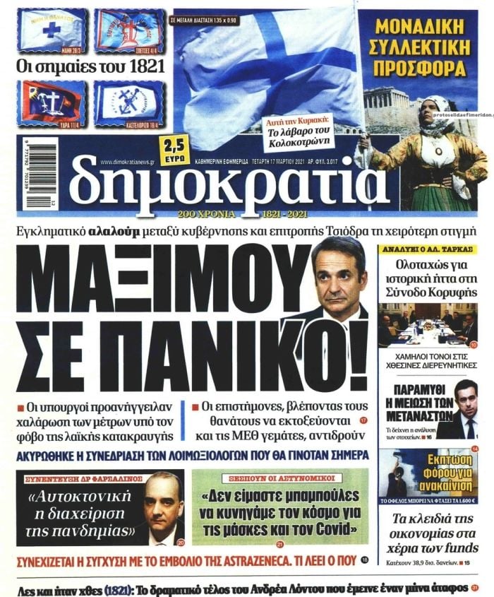 Διαβάστε στη «δημοκρατία»: Εγκληματικό αλαλούμ μεταξύ κυβέρνησης και επιτροπής Τσιόδρα τη χειρότερη στιγμή -Οι υπουργοί προανήγγειλαν χαλάρωση των μέτρων υπό τον φόβο της λαϊκής κατακραυγής – Οι επιστήμονες, βλέποντας τους θανάτους να εκτοξεύονται και τις ΜΕΘ γεμάτες, αντιδρούν -Ακυρώθηκε η συνεδρίαση της Επιτροπής λοιμωξιολόγων που θα γινόταν σήμερα