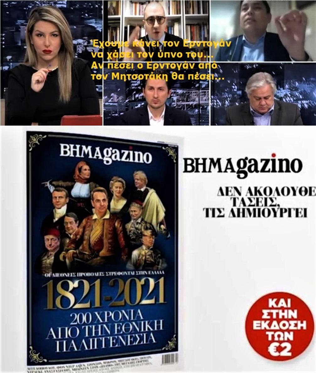 Σας θυμίζουμε ότι το περιοδικό BHMAGAZINO το οποίο αναμένεται να κυκλοφορήσει αυτή την Κυριακή με το πρωτοσέλιδό του να απεικονίζει σε σκίτσο τον Κυριάκο Μητσοτάκη ως Μακρυγιάννη, την Γιάννα Αγγελοπούλου ως Μπουμπουλίνα και γύρω τους βρίσκονται Ευρωπαίοι και μη ηγέτες αλλά και σημαίνοντες αξιωματούχοι της ΕΕ, ντυμένοι ως ήρωες του 1821.