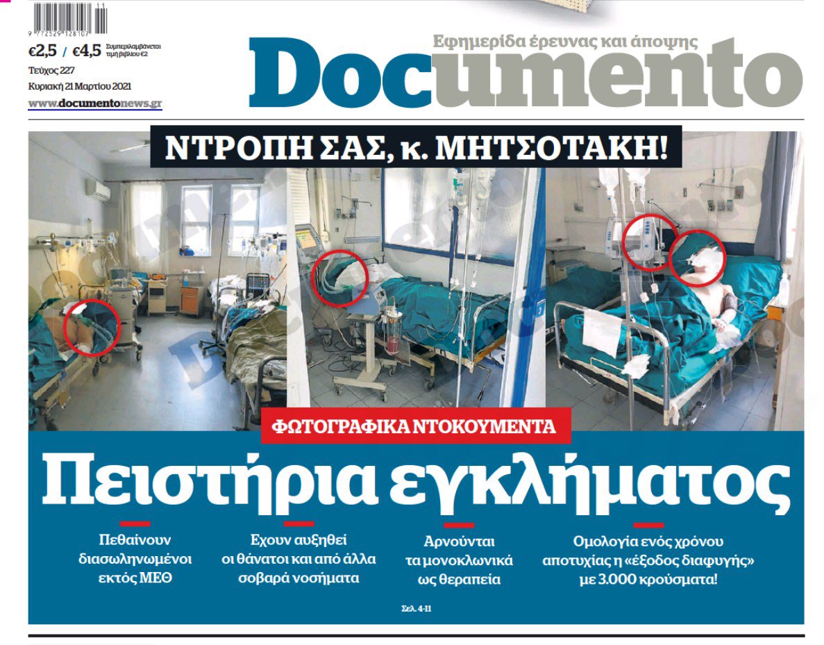 Το Κυριακάτικο Documento που κυκλοφορεί αύριο έχει πρωτοσέλιδο θέμα την κατάσταση στην υγεία και τα νοσοκομεία. Συμφωνα με έρευνα της εφημερίδας ασθενείς πεθαίνουν διασωληνωμένοι εκτός ΜΕΘ ενώ έχουν αυξηθεί οι θάνατοι και από άλλα σοβαρά νοσήματα.