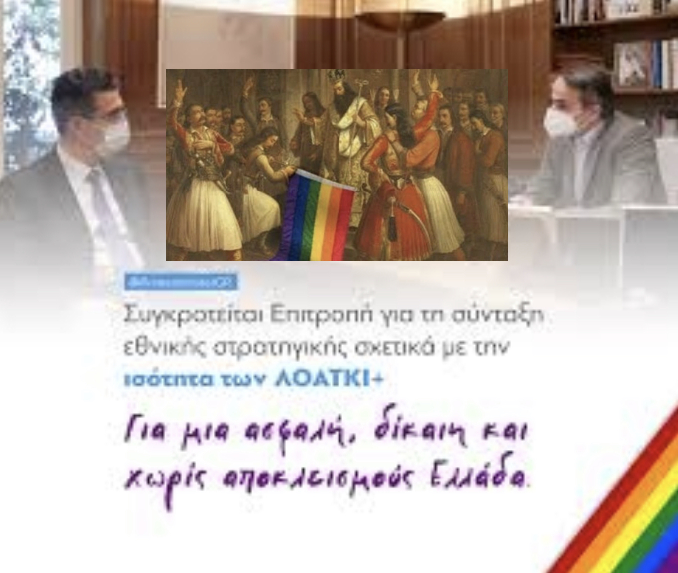 Με αφορμή λοιπόν την εξαγγελία του πρωθυπουργού για δημιουργία επιτροπής ίσων δικαιωμάτων για τους ΛΟΑΤΚΙ, η ελληνική κοινότητα ανάρτησε κολάζ από την στιγμή που καθαγιασμού του λάβαρού της εθνεγερσίας, μόνο που αντί για το λάβαρο είχαν βάλει την σημαία των ΛΟΑΤΚΙ!