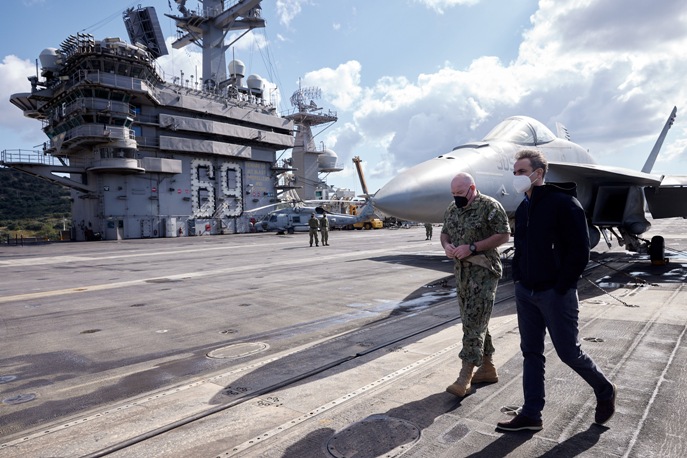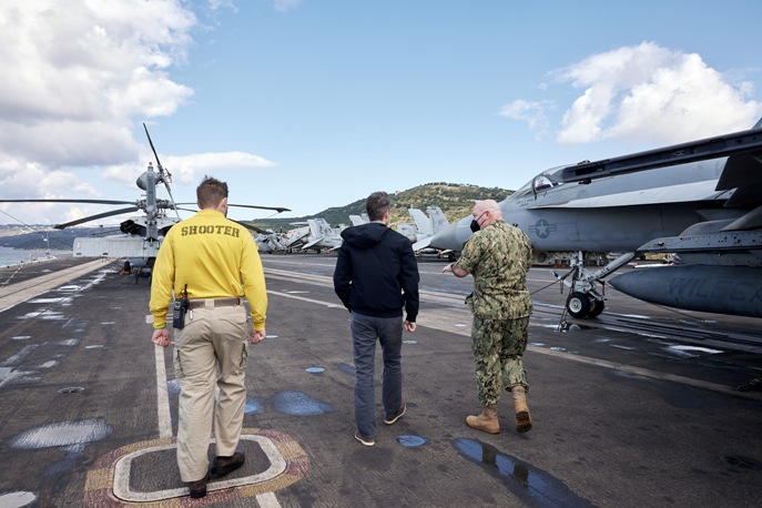 Ιδιαίτερης σημασίας είναι η επίσκεψη του πρωθυπουργού στο αεροπλανοφόρο του Ναυτικού των Ηνωμένων Πολιτειών USS Dwight D. Eisenhower που είναι ελλιμενισμένο στη ναυτική βάση της Σούδας. Άλλη μια επίσκεψη, στην οποία ο πρωθυπουργός εμφανίστηκε μπροστά στους Αμερικανούς αξιωματούχους και τον Αμερικανό πρέσβη με τα χέρια στις τσέπες!