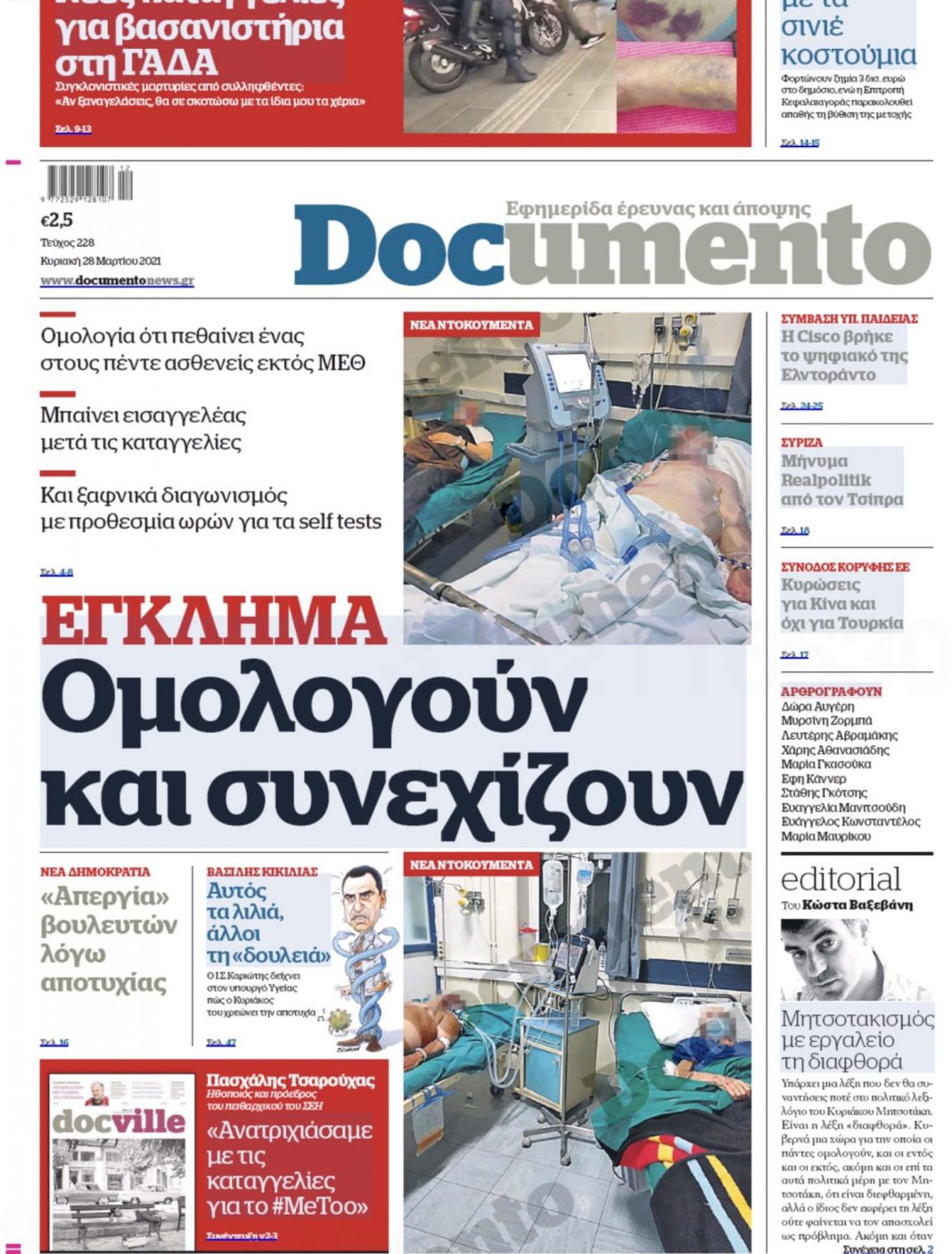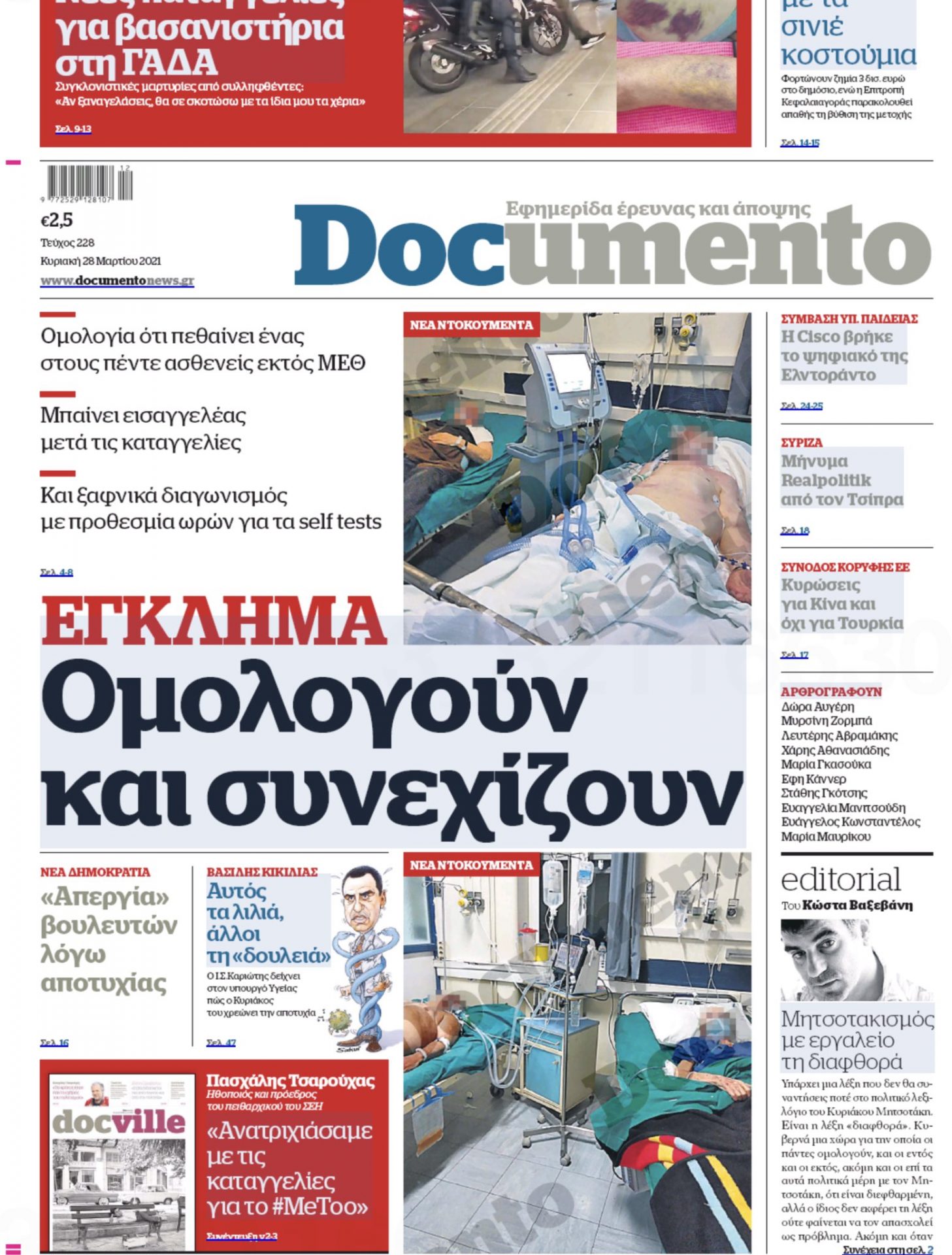 Την Κυριακή, το Documento δημοσίευσε φωτογραφίες από ασθενείς διασωληνωμένους εκτός ΜΕΘ. Τώρα ήρθε η ομολογία. Ποσοστό 20%, δηλαδή ένας στους πέντε, πεθαίνει εκτός ΜΕΘ. Αλλά το ποσοστό λένε, είναι πολύ μικρό. Όπως έλεγε και ο Πέτσας, ευτυχώς δεν πετάξαμε τα λεφτά σε ΜΕΘ.