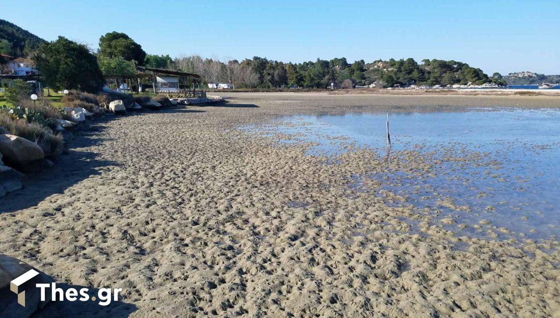 Οι εικόνες που κατέγραψε ο φωτογραφικός φακός του Θανάση Ελμάζη, είναι χαρακτηριστικές της κατάστασης, στην παραλία Φτερωτή στην Σιθωνία, η θάλασσα είναι δεκάδες μέτρα μακριά από το σημείο όπου μπορούν να δένουν οι ψαράδες τα καΐκια τους.