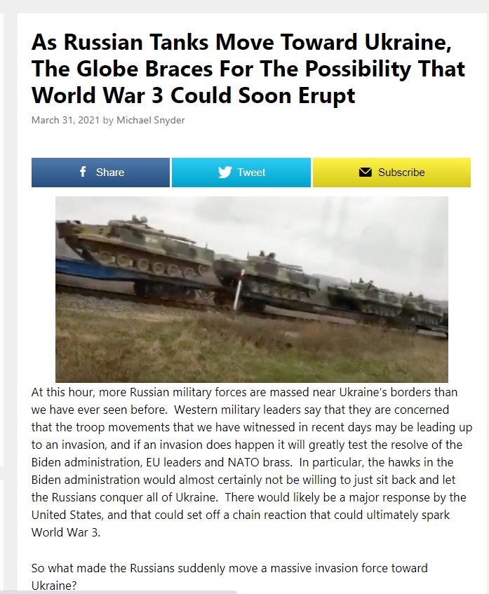 Δυτικοί στρατιωτικοί ηγέτες αναφέρουν ότι ανησυχούν ότι οι κινήσεις των στρατευμάτων που είδαμε τις τελευταίες ημέρες ενδέχεται να οδηγήσουν σε εισβολή, και εάν συμβεί εισβολή, θα δοκιμαστεί σε μεγάλο βαθμό η αποφασιστικότητα της κυβέρνησης Μπάιντεν, των ηγετών της ΕΕ και των επιτελών του ΝΑΤΟ. Συγκεκριμένα, τα γεράκια της κυβέρνησης Μπάιντεν είναι σχεδόν βέβαιο ότι δεν θα ήταν πρόθυμα να καθίσουν και να αφήσουν τους Ρώσους να κατακτήσουν όλη την Ουκρανία. Θα υπάρξει πιθανώς μια σημαντική απάντηση από τις Ηνωμένες Πολιτείες, και αυτό θα μπορούσε να πυροδοτήσει μια αλυσιδωτή αντίδραση που θα μπορούσε τελικά να προκαλέσει τον Τρίτο Παγκόσμιο Πόλεμο.