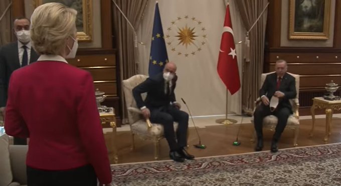 Ο ερντογάν έκανε μεγάλο διπλωματικό ατόπημα προφανώς εσκεμμένα, όταν η εμφανώς… απογοητευμένη πρόεδρος της Ευρωπαϊκής Επιτροπής Ursula von der Leyen υποβιβάστηκε και αναγκάστηκε να καθίσει σε έναν κοινωνικά απομακρυσμένο καναπέ, ενώ ο αρχηγός του Ευρωπαϊκού Συμβουλίου Charles Michel κάθισε σε μια πολυθρόνα δίπλα στον Ερντογάν στην Άγκυρα.