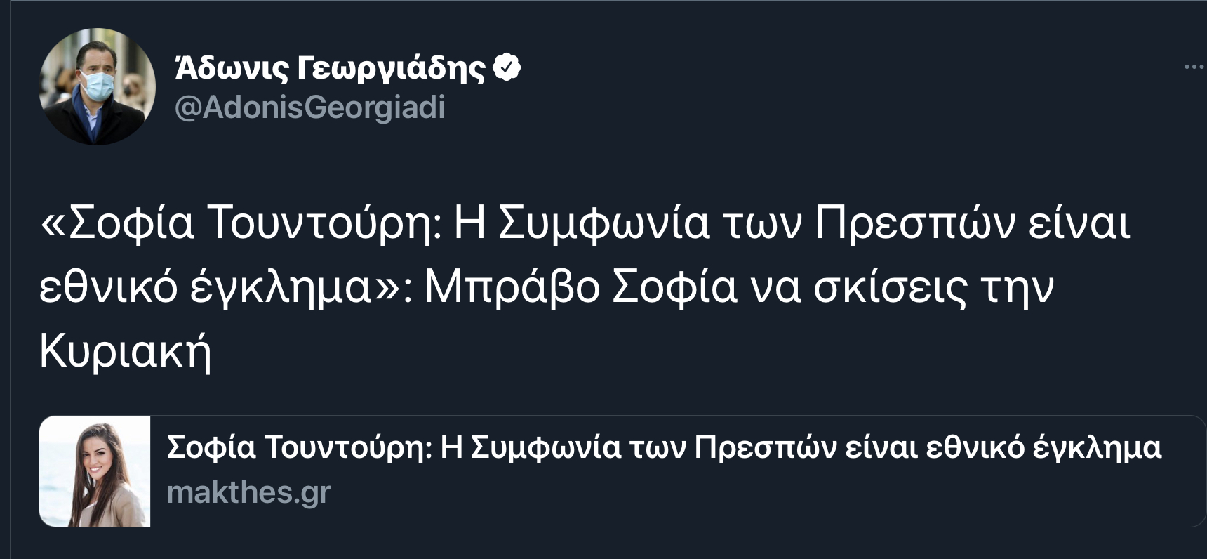 Μαζί με τους χιλιάδες που κατέβαιναν στα συλλαλητήρια παρέα με τον Άδωνι για την ακύρωση της συμφωνίας των Πρεσπών, Έτσι και η Σοφία Τουντούρη κατέρρευσε ακούγοντας τις σημερινές δηλώσεις του Άδωνι Γεωργιάδη. Απολύτως λογικό. Ξέρεις τι είναι εκεί που σε παίνευαν και έδειχναν ότι συμφωνούν μαζί σου για την μεθόδευση Κοτζιά, ξαφνικά να σε αφήνω ξεκρέμαστη; Χάνεται η Γη κάτω απ’τα πόδια σου.