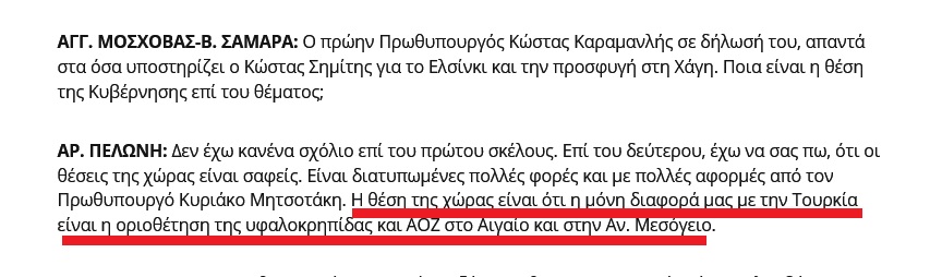 « …έχω να σας πω, ότι οι θέσεις της χώρας είναι σαφείς. Είναι διατυπωμένες πολλές φορές και με πολλές αφορμές από τον Πρωθυπουργό Κυριάκο Μητσοτάκη. Η θέση της χώρας είναι ότι η μόνη διαφορά μας με την Τουρκία είναι η οριοθέτηση της υφαλοκρηπίδας και θαλασσίων ζωνών στο Αιγαίο και στην Αν. Μεσόγειο.».