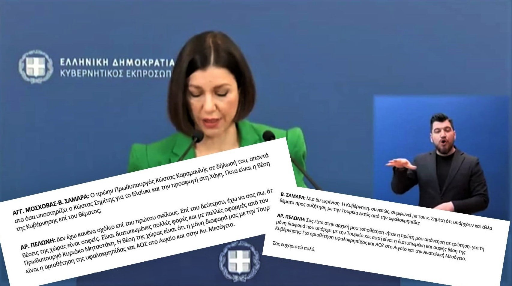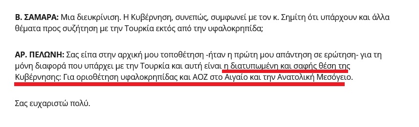 Μάλιστα η κα Πελώνη όταν της ζητήθηκε με νέα ερώτηση να διευκρινίσει αν η κυβέρνηση συμφωνεί με τον Κώστα Σημίτη, ότι υπάρχουν και άλλες διαφορές με την Τουρκία πέραν της υφαλοκρηπίδας επανέλαβε: “Σας είπα στην αρχική μου τοποθέτηση -ήταν η πρώτη μου απάντηση σε ερώτηση- για τη μόνη διαφορά που υπάρχει με την Τουρκία και αυτή είναι η διατυπωμένη και σαφής θέση της Κυβέρνησης: Για οριοθέτηση υφαλοκρηπίδας και θαλασσίων ζωνών στο Αιγαίο και την Ανατολική Μεσόγειο“.