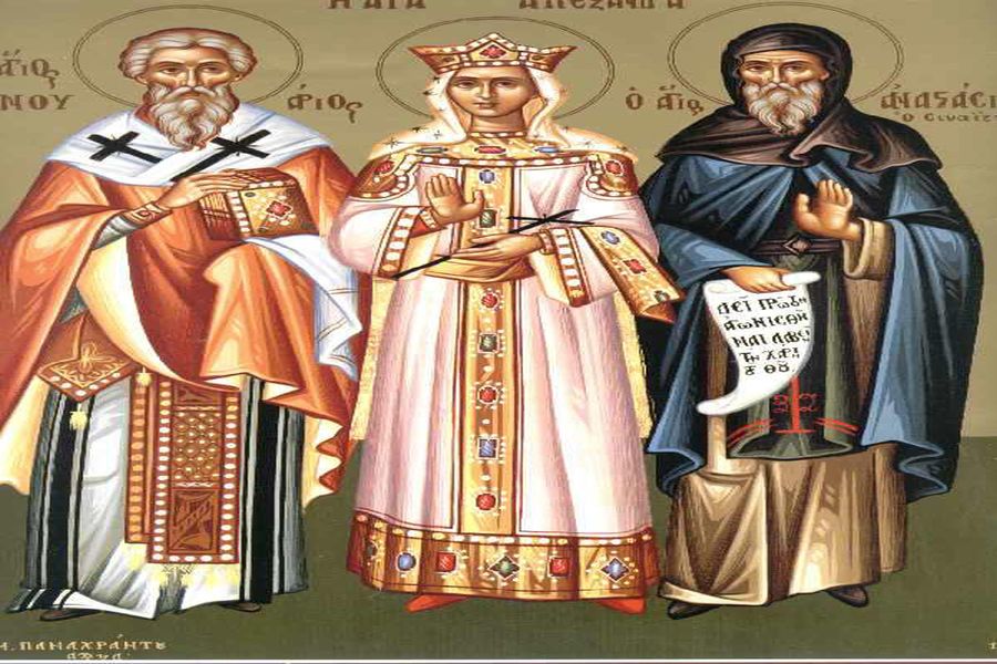 Ή αγία Αλεξάνδρα ήταν σύζυγος του Βασιλιά Διοκλητιανού. Εντελώς διαφορετική όμως από ‘κείνον, πού ήταν φίλος της βίας και του αίματος. Αυτή διακρινόταν για την ήμερη ψυχική της διάθεση και την εύσπλαχνη και φιλάνθρωπη ζωή της. Στό μεταξύ μια χριστιανή της μετέδωσε το λόγο του Θεού, πού τη συγκίνησε τόσο, ώστε με χαρά τον αποδέχτηκε. Ή χάρη του Κυρίου μεγάλωνε μέσα της το φωτισμό, και το θείο έλεος την αξίωσε κατά το μαρτύριο του αγίου Γεωργίου, να αισθανθεί μέσα της την πνοή και την ορμή της πίστης στο Χριστό. Τότε παρακάλεσε τον αυτοκράτορα σύζυγο της, να διατάξει την παύση τω διωγμών εναντίον των Χριστιανών. Και διακήρυξε ότι καταγγέλλει μπροστά στον αληθινό θεό τους διώκτες των χριστιανών, και ομολογεί και αυτή τον Ιησού Χριστό. ο αυτοκράτορας στην αρχή, νόμισε ότι ή σύζυγος του έπαθε διανοητική διατάραξη. ‘Αλλ’ εκείνη διαμαρτυρήθηκε και επανέλαβε την ομολογία της. ο Διοκλητιανός τότε εξοργισμένος, διέταξε και την έριξαν στην πιο σκοτεινή φυλακή, όπου και πέθανε προσευχομένη. Το παράδειγμα της συγκίνησε και τρεις από τους ακολούθους της, τον Άπολλώ, τον Ίσαάκιο και τον Κοδράτο. Ομολόγησαν και αυτοί ότι είναι χριστιανοί και τον μεν Κοδράτο αποκεφάλισαν, τους δε Άπολλώ και Ίσαάκιο υπέβαλαν σε θάνατο δια πείνας και δίψας.