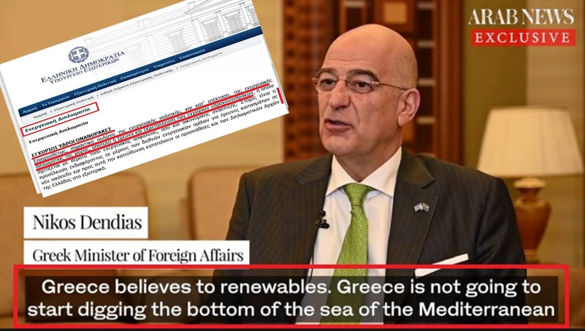 Σας θυμίζουμε τι δήλωσε χθες ο Νίκος Δένδιας στο Arab News… Η Ελλάδα πιστεύει στις ΑΠΕ, δεν πρόκειται να κάνει εξορύξεις για αέριο & πετρέλαιο στην Α. Μεσόγειο