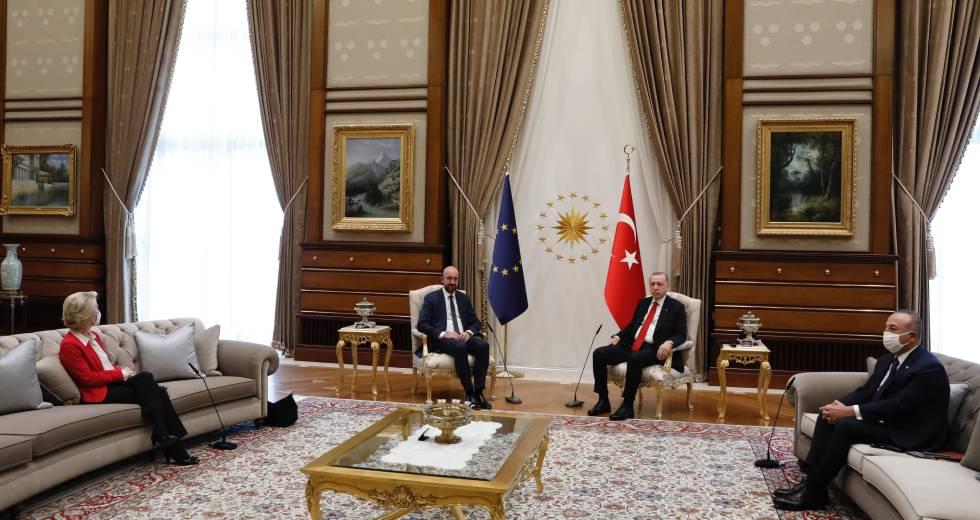 Ήταν τοτε η υφήλιος έμεινε άφωνη με τον τούρκο σουλτάνο και τον ρεμπεσκέ Σαρλ Μισέλ να στρογγυλοκάθονται αφήνοντας την πρόεδρο όρθια και γεμάτη απορία.