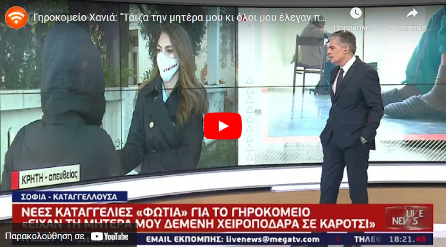 «Όταν την επισκέφθηκα μετά από λίγες ημέρες δεν είχε επαφή» σημείωσε η κυρία Σοφία, αποκαλύπτοντας ότι σε μεταγενέστερη επίσκεψή της βρήκε τη μητέρα της σε ένα καρότσι στο υπόγειο, δεμένη, μαζί με άλλους 20 τρόφιμους του γηροκομείου.