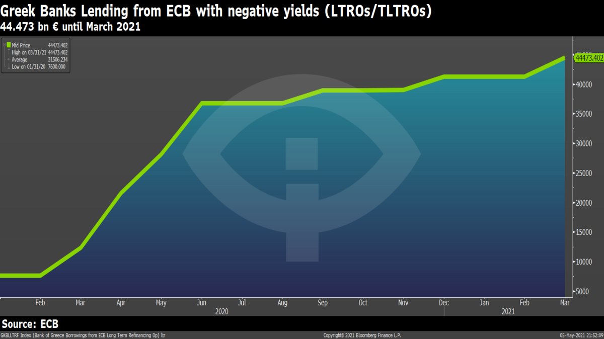 Οιι Ελληνικές τράπεζες έχουν δανειστεί από την ΕΚΤ με αρνητικά επιτόκια έως -1% (δηλαδή κερδίζουν από τον δανεισμό αυτό) έως το Μάρτιο του 2021, 44,5 δις € και έχουν δανείσει το 2020 μόνο 5,5 δις €, όταν ο σκοπός του προγράμματος είναι ο δανεισμός των Μικρομεσαίων Επιχειρήσεων.
