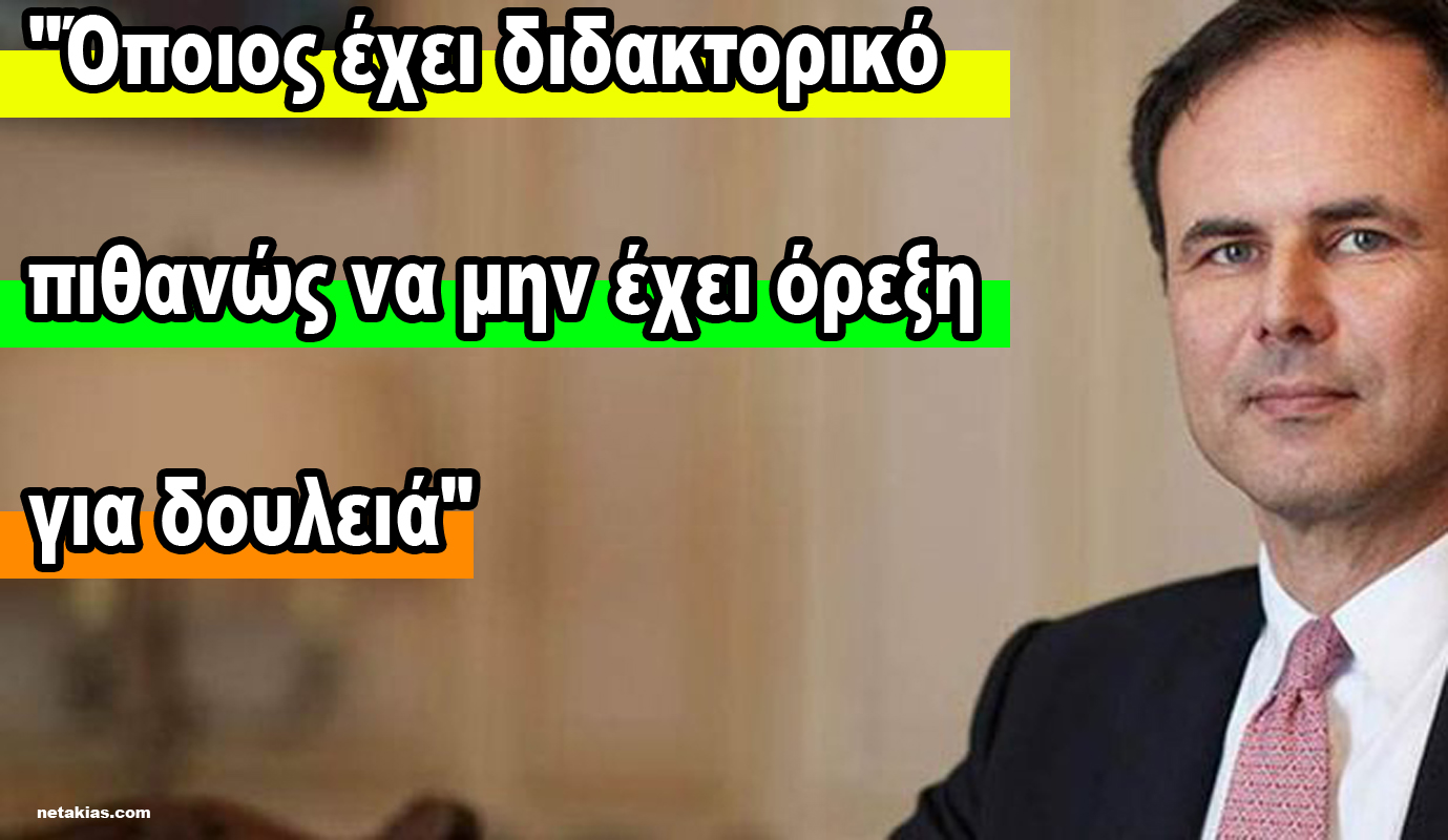 «Για τις πιο πολλές δουλειές που μπορεί να κάνει κάποιος μετά τις σπουδές του όχι απλώς δεν είναι απαραίτητο το διδακτορικό αλλά είναι και κάτι το αρνητικό. Δε θα προσλάμβανα κάποιον με διδακτορικό αν μου έκανε αίτηση γιατί δείχνει ότι πιθανώς να είναι κάποιος άνθρωπος που δεν έχει απαραιτήτως όρεξη για δουλειά». Αυτή είναι η άποψη του επικεφαλής στο οικονομικό γραφείο του πρωθυπουργού, Αλέξη Πατέλη, όπως την κατέθεσε μιλώντας στο ImpacTalk.