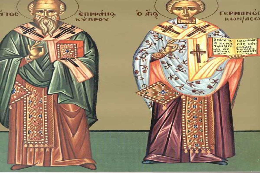 Τούς διττούς ύποφήτας της άναρχου θεότητας, των θεοτυπώτων δογμάτων, τους πανσόφους έκφάντορας, συν τω Έπιφανίω τω κλεινώ, ύμνήσωμεν τον θείον Γερμανών ως λαμπροί γαρ των αρρήτων μυσταγωγοί, πυρσεύουσι τους κράζοντας δόξα τω στεφανώσαντι υμάς, δόξα τω μεγαλύναντι, δόξα τω βεβαιούντι δι’ υμών, πίστιν την Ορθόδοξον.