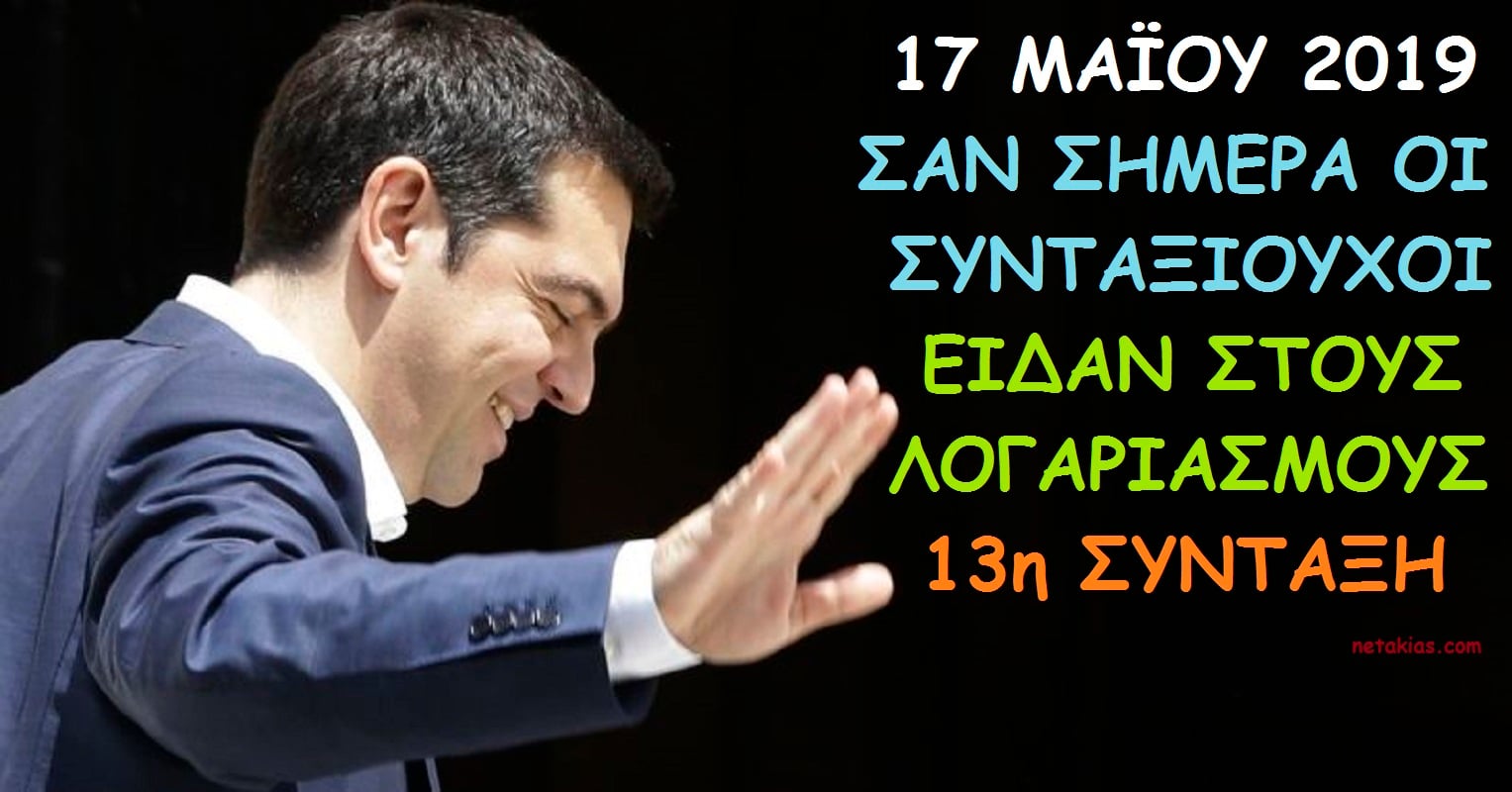 Σαν σήμερα, στις 17 Μαΐου 2019, έμπαινε στους λογαριασμούς όλων των συνταξιούχων, η καταργηθήσα 13η Σύνταξη. Φυσικά δεν είχαμε κλείσει ακόμη ούτε 9 μήνες από το τέλος των μνημονίων, το καλοκαίρι του 2018, αλλά ήταν το πρώτο βήμα επιστροφής στην κανονικότητα, μετά την καταστροφή που είχαν προκαλέσει οι κυβερνήσεις ΠΑΣΟΚ, Παπαδήμιου και Σαμαροβενιζέλων.