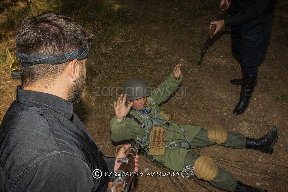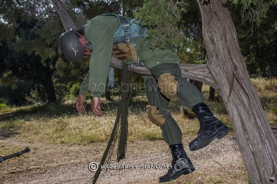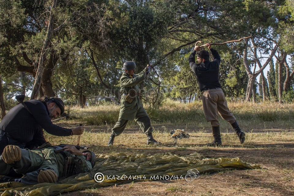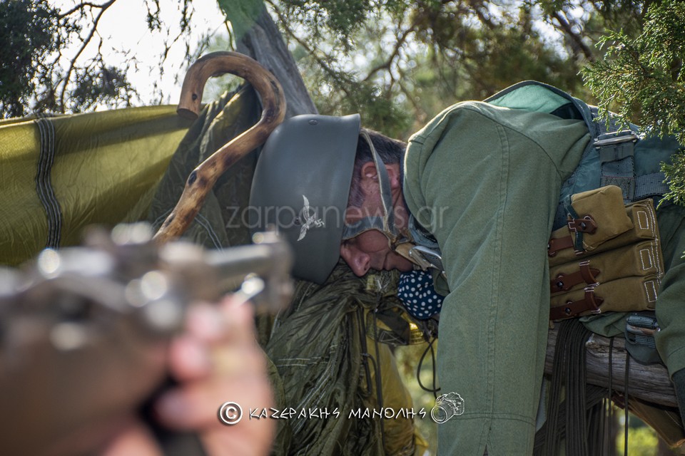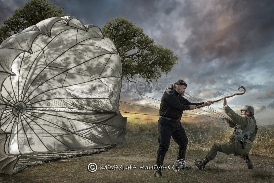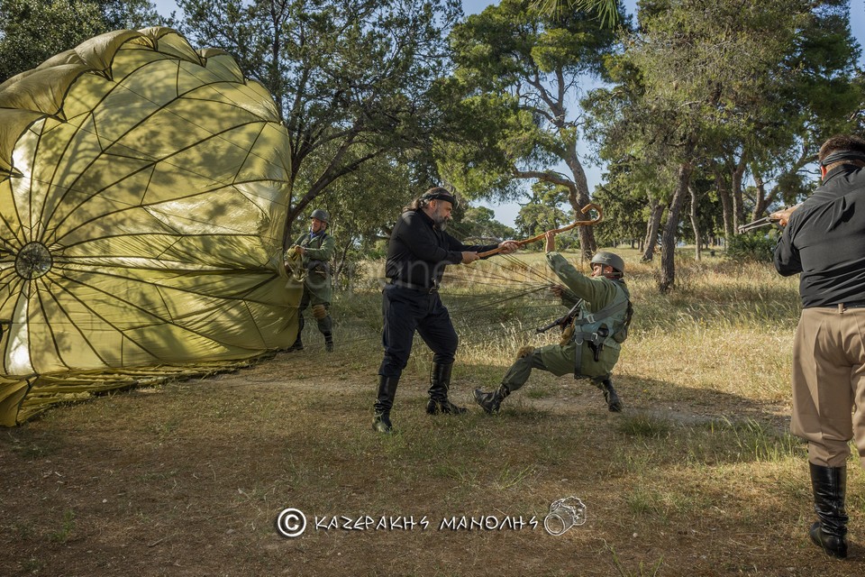 Ο Μανώλης Καζεράκης, φωτογράφος και μέλος της Ομοσποδίας, ανέφερε: “Πάντα κατεβαίναμε στη Μητρόπολη, πηγαίναμε στο Σύνταγμα για κατάθεση στεφάνων, φέτος δεν θα γινόταν αυτό. Και σκέφτηκα να κάναμε κάτι άλλο, με τη βοήθεια και του προέδρου της Ομοσπονδίας. Βρήκα τα παιδιά που είναι μια παρέα αναβιωτών και στο Πάρκο Τρίτση κάναμε την αναπαράσταση. Αυτοί έχουν γνήσιες στολές, αλεξίπτωτα, το απαραίτητο υλικό. Μας πήρε περίπου τρεις ώρες.”