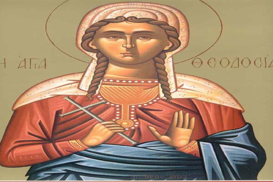 Ό θεοκίνητος Απ. Παύλος είπε: Ήρμοσάμην υμάς ένί άνδρί, παρθένον άγνήν παραστήσαι τω Χριστώ”1. Έκανα τους αρραβώνες σας με έναν άνδρα, το Χριστό, για να σας παρουσιάσω παρθένο αγνή σ’ Αυτόν. Δηλαδή, να παρουσιάσω τις ψυχές σας αγνές και καθαρές από κάθε πλάνη και αμαρτία, ενωμένες με την πίστη και την αγάπη σε μια πνευματική νύμφη, της οποίας νυμφίος να είναι ο Χριστός. Μια τέτοια ψυχή ήταν και ή παρθενομάρτυς Θεοδοσία. Καταγόταν από τη Φοινίκη και δεν είχε μόνο παρθενικό σώμα, αλλά και παρθενική ψυχή. Από ηλικία 18 χρονών, έλαμπε για το ζήλο και τη θερμή της πίστη, ανάμεσα στις νεαρές ειδωλολάτρισσες γυναίκες. Αυτό καταγγέλθηκε στον άρχοντα Ουρβανό, πού με κάθε δελεαστικό τρόπο προσπάθησε να την πείσει να αρνηθεί το Χριστό. Όμως ή παρθένος Θεοδοσία έμεινε αμετακίνητη στο Ιερό της πιστεύω. ο Ουρβανός, βλέποντας την αδάμαστη επιμονή της, εξοργίστηκε και με θηριώδη τρόπο έσπασε τα κόκκαλά της και πριόνισε τις σάρκες της. Έπειτα, την πλησίασε και της πρότεινε να αλλαξοπιστήσει, έστω και την τελευταία στιγμή, και αυτός θα θεράπευε αμέσως τις πληγές της. Ή Θεοδοσία μισοπεθαμένη απάντησε: “Είμαι χριστιανή”. Τότε ο τύραννος διέταξε και την έριξαν στη θάλασσα, οπού και παρέδωσε το πνεύμα της.