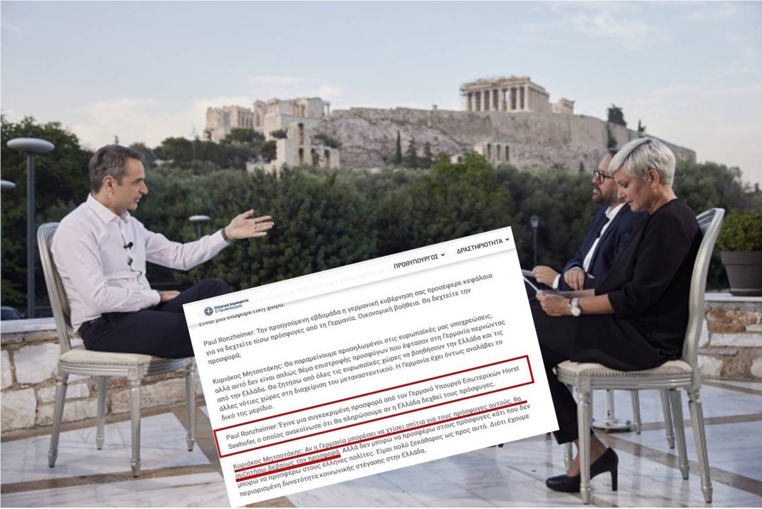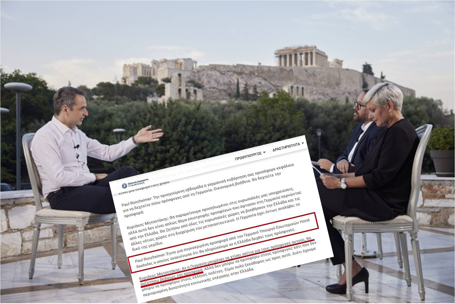 Κυριάκος Μητσοτάκης: Αν η Γερμανία μπορέσει να χτίσει σπίτια για τους πρόσφυγες αυτούς, θα συζητήσω βεβαίως την προσφορά. Αλλά δεν μπορώ να προσφέρω στους πρόσφυγες κάτι που δεν μπορώ να προσφέρω στους έλληνες πολίτες. Είμαι πολύ ξεκάθαρος ως προς αυτό. Διότι έχουμε περιορισμένη δυνατότητα κοινωνικής στέγασης στην Ελλάδα.