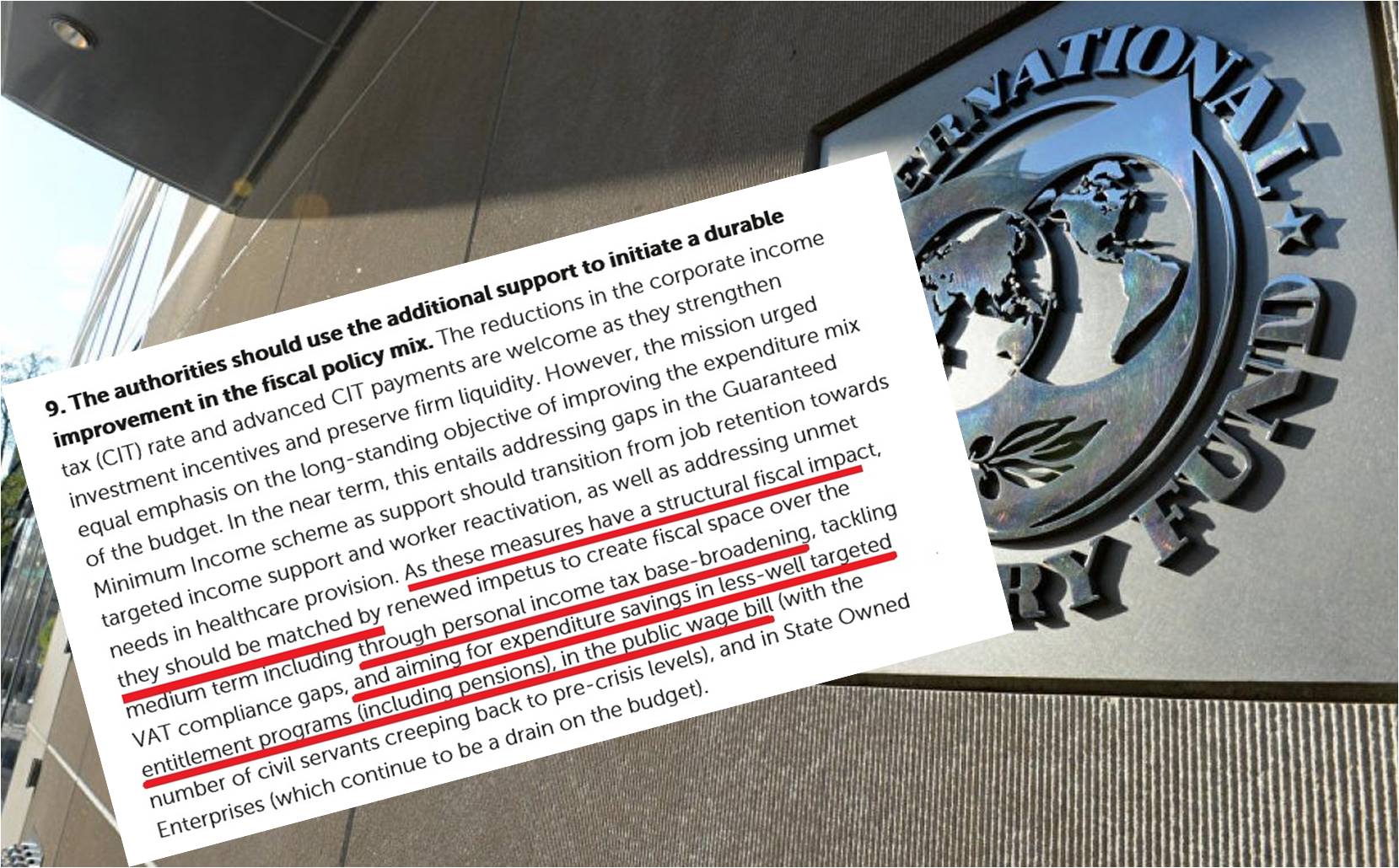 Οι μειώσεις του συντελεστή φόρου εισοδήματος εταιρειών (CIT) και των προηγμένων πληρωμών CIT είναι ευπρόσδεκτες καθώς ενισχύουν τα επενδυτικά κίνητρα και διατηρούν σταθερή ρευστότητα. Ωστόσο, η αποστολή προέτρεψε την ίδια έμφαση στον μακροχρόνιο στόχο της βελτίωσης του συνδυασμού δαπανών του προϋπολογισμού. Βραχυπρόθεσμα, αυτό συνεπάγεται την αντιμετώπιση των κενών στο σύστημα Εγγυημένου Ελάχιστου Εισοδήματος, καθώς η υποστήριξη θα πρέπει να μεταβεί από τη διατήρηση θέσεων εργασίας σε στοχευμένη υποστήριξη εισοδήματος και επανενεργοποίηση εργαζομένων, καθώς και να αντιμετωπίσει τις ανεκπλήρωτες ανάγκες στην παροχή υγειονομικής περίθαλψης.