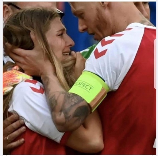 Και καπάκι βρήκε χρόνο να πάει στην κερκίδα και να δώσει κουράγιο στην σύζυγο του άτυχου – τυχερού Έρικσεν, που σοκαρισμένη έβλεπε τον σύζυγο και πατέρα των δυο ανήλικων παιδιών της, να παλεύει με τον θάνατο. Όπως αποτυπώνεται στην παραπάνω φωτό.