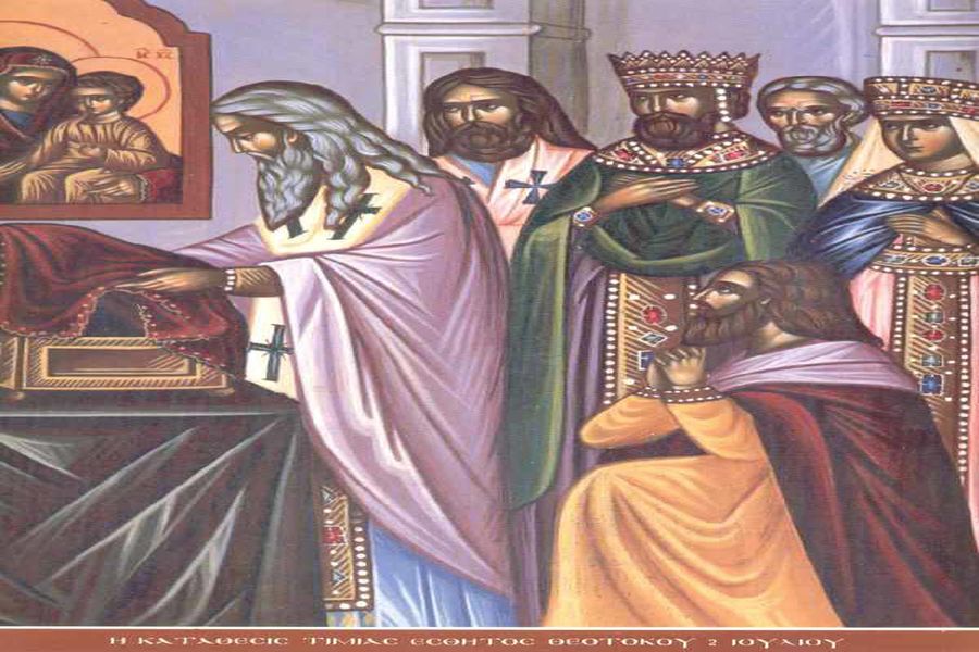 Στο ναό των Βλαχερνών, που είχε κτίσει η βασίλισσα Πουλχερία, κόρη του αυτοκράτορα Αρκαδίου και σύζυγος του αυτοκράτορα Μαρκιανού (451-457), είχαν κατατεθεί τα σπάργανα (εντάφια) της Θεοτόκου, τα όποια είχαν σταλεί από τον Πατριάρχη Ιεροσολύμων, Ιουβενάλιο. Όταν δε ήταν αυτοκράτορας ο Λέων Α’ ο Θράξ (457-474), οι πατρίκιοι Γάλβιος και Κάνδιδος έφεραν από τα Ιεροσόλυμα και την τίμια εσθήτα της Ύπεραγίας Θεοτόκου. Ο Λέων την παρέλαβε και την κατέθεσε στο ναό των Βλαχερνών, μέσα σε χρυσή λάρνακα. Η εσθήτα αυτή υπήρχε μέσα στο ναό των Βλαχερνών μέχρι το έτος 820. Αλλά ο ναός αυτός το 1070 κάηκε και κατόπιν, αφού ανοικοδομήθηκε, από απροσεξία ξανακάηκε στις 19 Ιανουαρίου του 1434. Βέβαια, πάντα τα τίμια αντικείμενα της Υπεραγίας Θεοτόκου γίνονται αφορμή στους αγωνιζόμενους χριστιανούς να μιμηθούν την αρετή της. Και όπως, λοιπόν, αυτή διετήρει πάντα τα ρήματα (του Κυρίου) εν τη καρδία αυτής”1, διατηρούσε, δηλαδή, τα λόγια του Υιού της βαθειά χαραγμένα στην καρδιά της, έτσι ας κάνουμε κι εμείς.