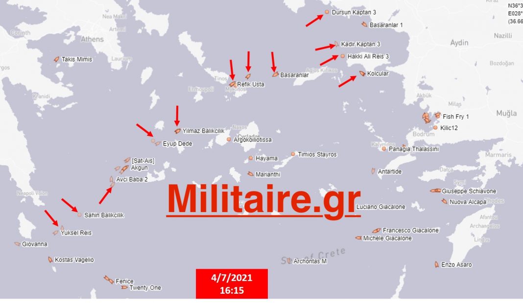 Μόνο που η γαλήνη δεν ήρθε από την υποχώρηση της Τουρκίας αλλά από την ανεξήγητη ελληνική ανεκτικότητα. Στον χάρτη από το marinetraffic τα στίγματα των τουρκικών αλιευτικών σήμερα! Χρειάζεται κάποιο σχόλιο;