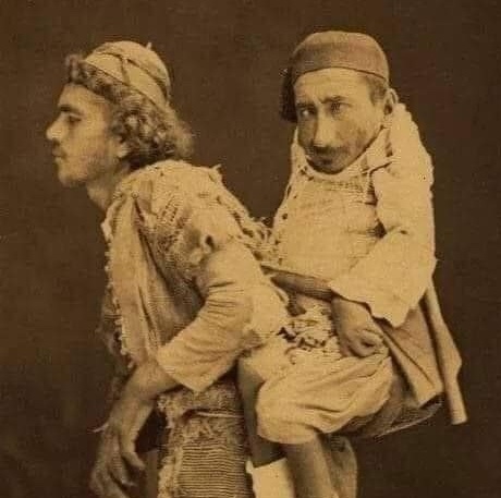 Αυτή η φωτογραφία τραβήχτηκε στη Δαμασκό το 1899: ο ανάπηρος νάνος είναι Samir είναι Χριστιανός κι ανίκανος να περπατήσει, αυτός που τον κουβαλάει στην πλάτη του είναι Mohamed, είναι Μουσουλμάνος και τυφλός και υπολογίζει στον Σαμίρ για να του λέει τον δρόμο.