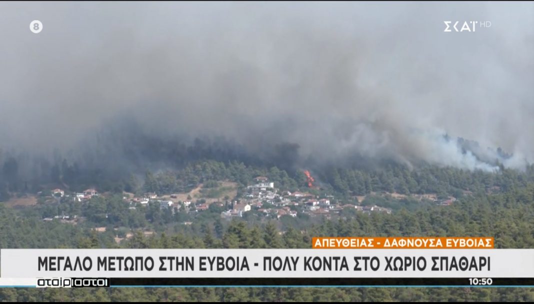 Μια μεγάλη εστία φωτιάς υπάρχει από νωρίς το πρωί στο χωριό Σπαθάρι καθως άλλαξε η φορά του ανέμου με αποτέλεσμα η φωτιά να ξαναπροσεγγίσει το χωριό και οι φλόγες σύμφωνα με τους κατοίκους έχουν φτάσει στην πλατεία.