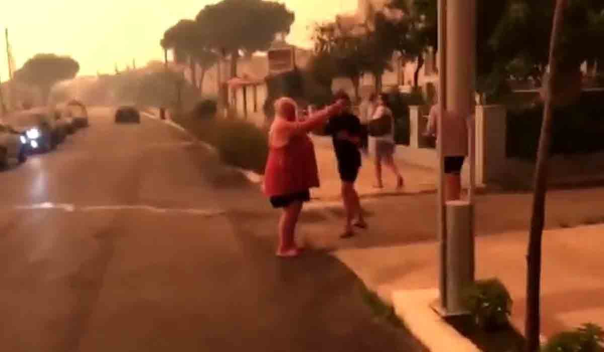 Η γυναίκα από την Εύβοια ούσα απεγνωσμένη και έντρομη, φωνάζει: «Παιδιά καιγόμαστε, ένα αεροπλάνο δεν μπορεί να ‘ρθει; Καιγόμαστε», με τον αστυνομικό να της λέει ειρωνικά: