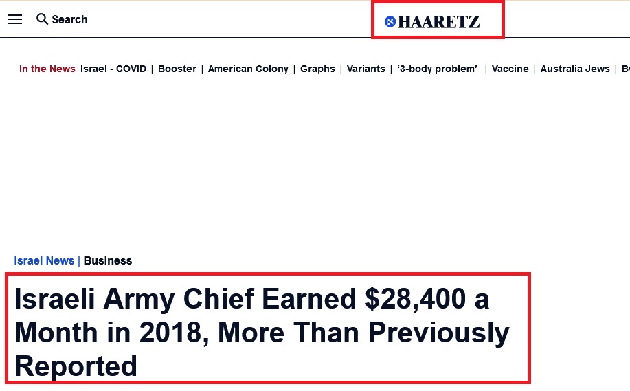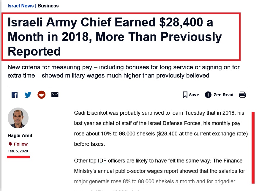 Ακολουθεί απόσπασμα άρθρου (5 Φεβ. 2020) της γνωστής Ισραηλινής εφημερίδας και ιστοσελίδας “Haaretz”, σχετικά με τις μηνιαίες αποδοχές του Αρχηγού των Ε.Δ και ανώτατων αξιωματικών στο Ισραήλ...