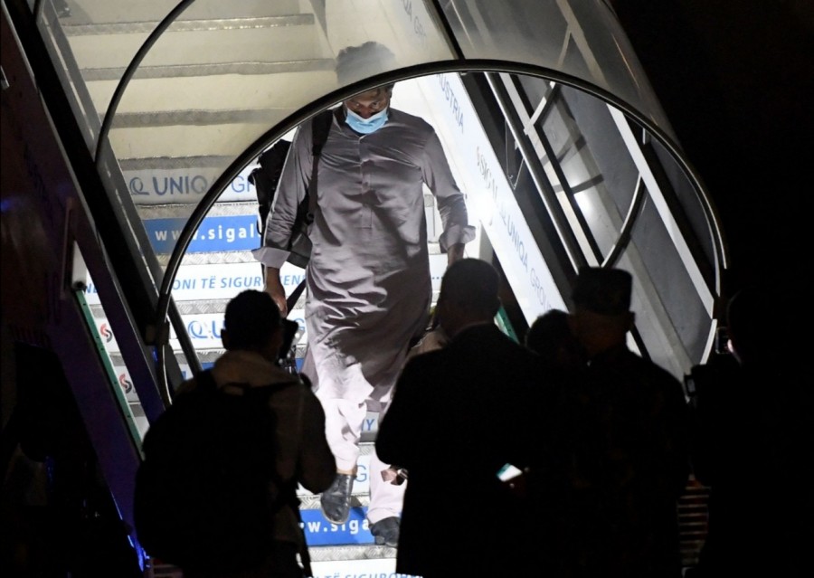 Οι πρώτοι 121 Αφγανοί πολίτες που κατέβηκαν τα σκαλιά του αεροπλάνου ένα προς ένα συνοδευόμενα από την Υπουργό Εξωτερικών της Αλβανίας Όλτα Τζάτσκα και την Αμερικανίδα Πρέσβη Γιούρι Κίμ.