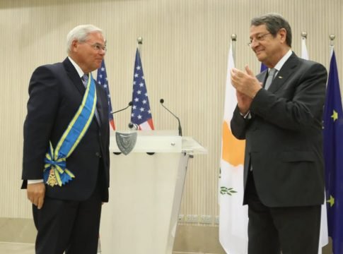 Ο Πρόεδρος της Κυπριακής Δημοκρατίας Νίκος Αναστασιάδης τίμησε τον Αμερικανό Γερουσιαστή και Πρόεδρο της Επιτροπής Εξωτερικών Σχέσεων της Γερουσίας Ρόμπερτ Μενέντεζ με ο παράσημο του Μεγαλόσταυρου του Τάγματος του Μακαρίου Γ΄.