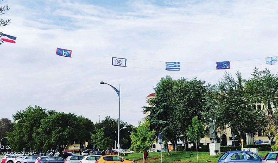 Θεσσαλονίκης μαζί με ελληνικές σημαίες. Στο κέντρο της Θεσσαλονίκης, πάνω από τις