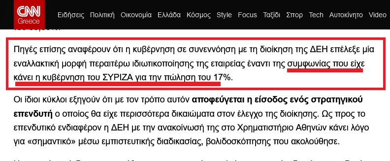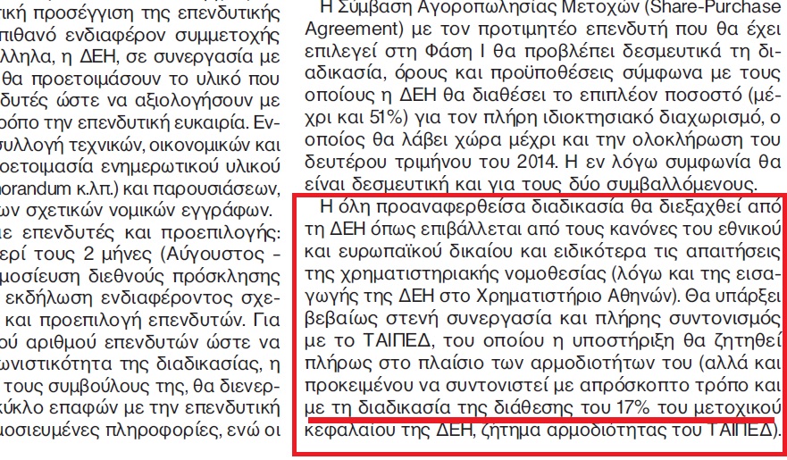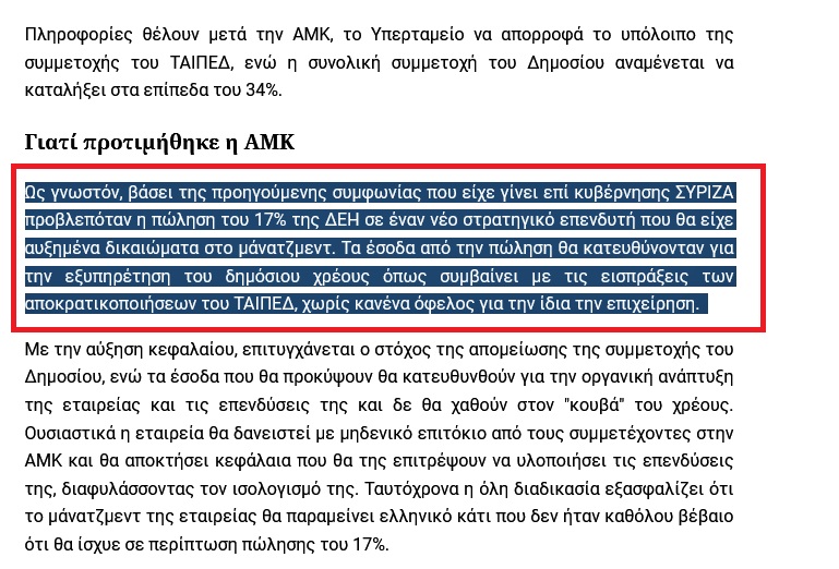 “Ως γνωστόν, βάσει της προηγούμενης συμφωνίας που είχε γίνει επί κυβέρνησης ΣΥΡΙΖΑ προβλεπόταν η πώληση του 17% της ΔΕΗ σε έναν νέο στρατηγικό επενδυτή που θα είχε αυξημένα δικαιώματα στο μάνατζμεντ. Τα έσοδα από την πώληση θα κατευθύνονταν για την εξυπηρέτηση του δημόσιου χρέους όπως συμβαίνει με τις εισπράξεις των αποκρατικοποιήσεων του ΤΑΙΠΕΔ, χωρίς κανένα όφελος για την ίδια την επιχείρηση.”