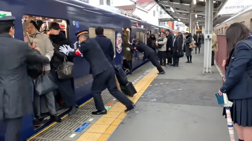 Υπάρχουν ειδικοί υπάλληλοι επιφορτισμένοι με το να σπρώχνουν τους επιβάτες, για να στοιβαχτούν σαν “σαρδέλες” στα βαγόνια…