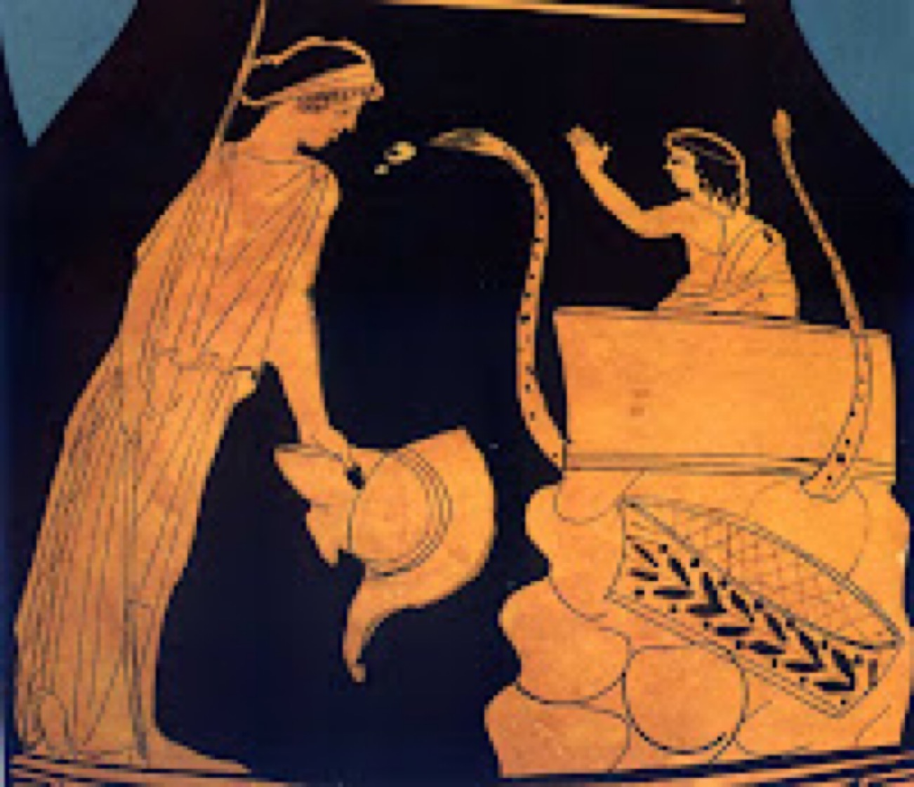 Αυτή την κίστη την έδωσε στις 3 κόρες του Κέκροπος,Άγραυλος,Έρση & Πάνδροσος,(του πρώτου Βασιλιά της Αθήνας) με την ρητή εντολή να μην την ανοίξουν.Να θυμίσω εδώ ότι & ο Κέκροπας λέγεται ότι γεννήθηκε απο την γη της Αττικής,την Κεκροπία).