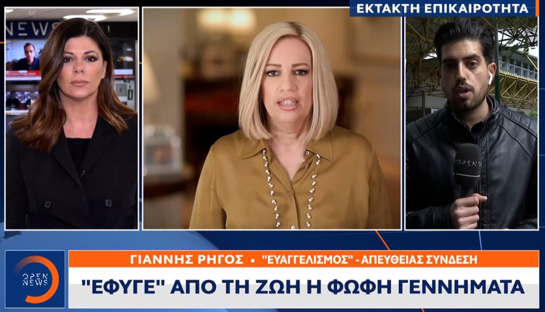 Με δάκρυα στα μάτια, η παρουσιάστρια του Open, Λίνα Δρούγκα μετέδωσε την είδηση συγκλονισμένη: «Διακόπτουμε το πρόγραμμά μας για μια εξαιρετικά δυσάρεστη είδηση. Η Φώφη Γεννηματά δεν είναι πλέον κοντά μας. Τραγική η είδηση του θανάτου της»δήλωσε στον αέρα με σπασμένη φωνή, βουρκωμένη.