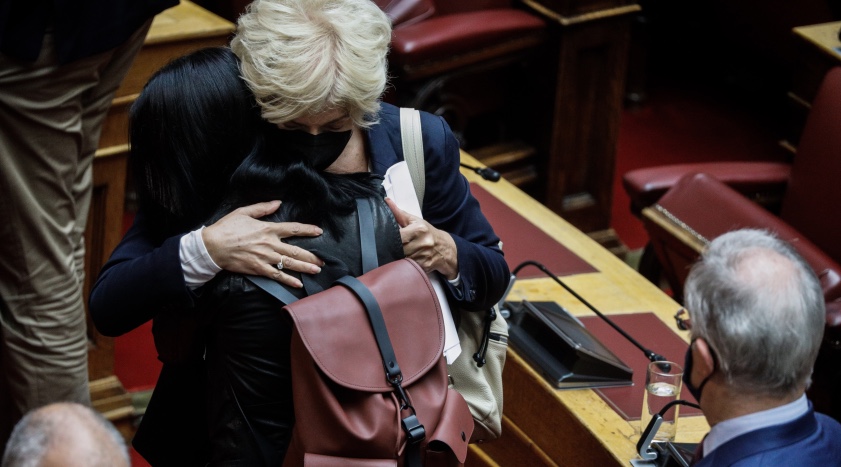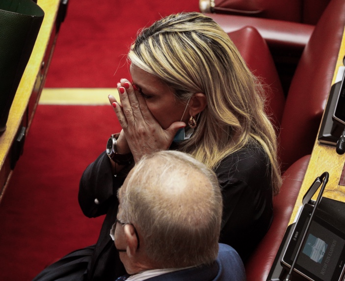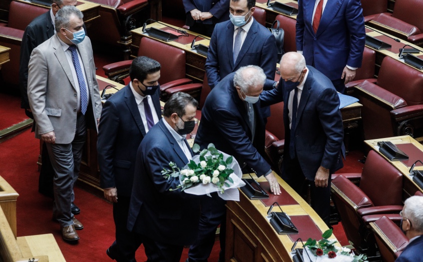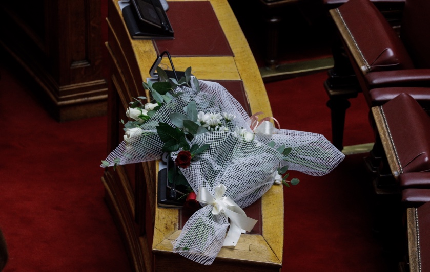 Συγκλονισμένοι οι βουλευτές μετά την ανακοινωση του θανάτου της Φωφης Γεννηματα. Ο πρόεδρος της Βουλής Κωνσταντίνος Τασούλας και πολλοί βουλευτές άφησαν λίγα λουλούδια στο έδρανο όπου καθόταν συνήθως η Φωφη Γεννηματα.