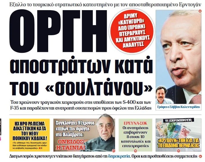 Σήμερα στη «δημοκρατία»: Έξαλλο το τουρκικό στρατιωτικό κατεστημένο με τον αποσταθεροποιημένο Ερντογάν – Του χρεώνουν τραγικούς χειρισμούς στις υποθέσεις των S-400 και των F-35 και παραδέχονται ανατροπή συσχετισμών προς όφελος της Ελλάδας – Γράφει ο Σάββας Καλεντερίδης. Πρωτοσελιδα – Ειδήσεις