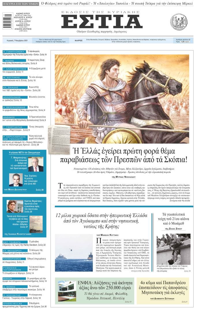 Με ένα σημαντικό πρωτοσέλιδο που αφορά την συμφωνία των Πρεσπών κυκλοφορεί αυτή την Κυριακή η εφημεριδα Εστία.