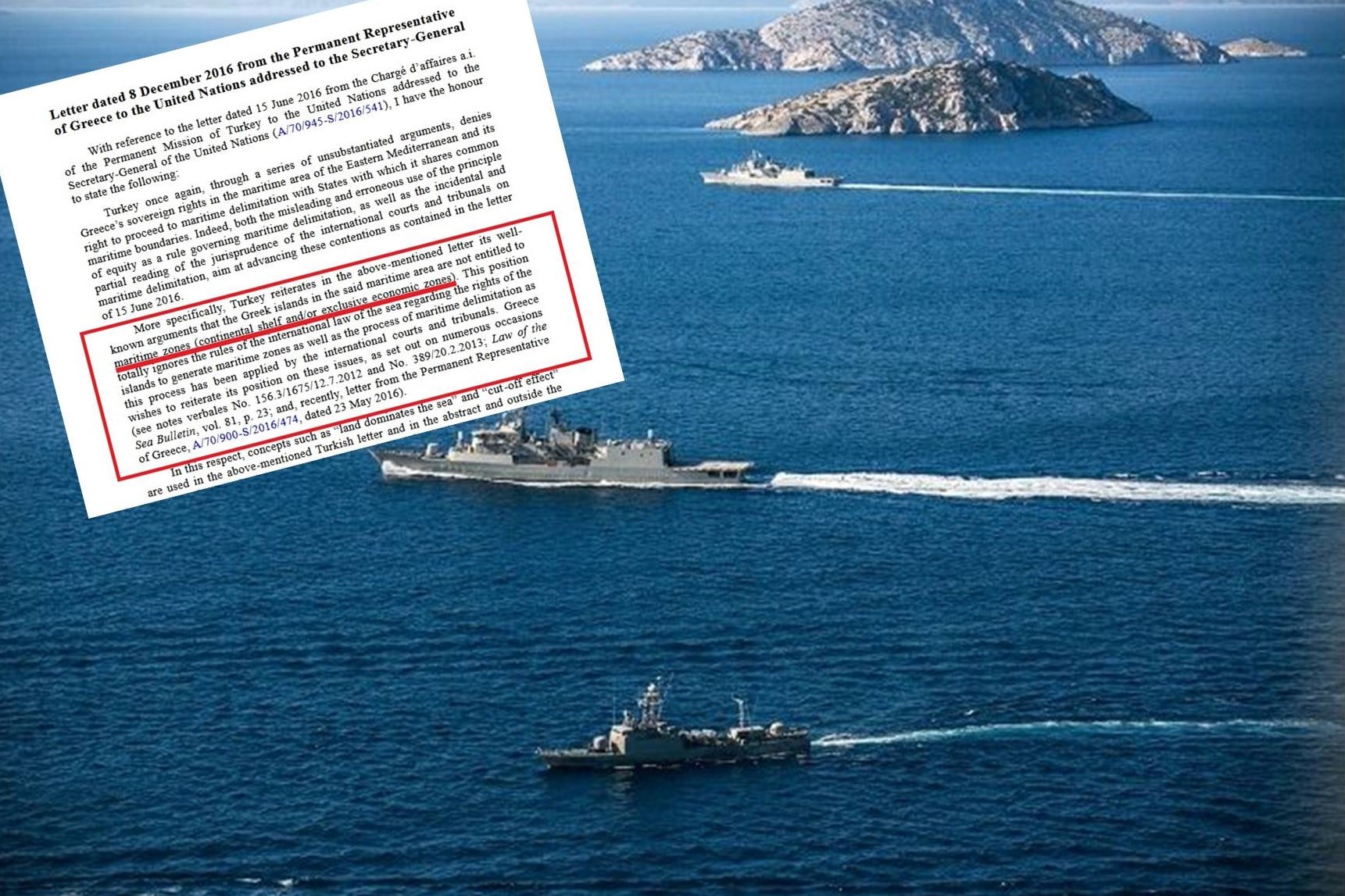 Ειδικότερα, η Τουρκία επαναλαμβάνει στην προαναφερθείσα επιστολή τα γνωστά επιχειρήματά της ότι τα ελληνικά νησιά στην εν λόγω θαλάσσια περιοχή δεν έχουν δικαίωμα σε θαλάσσιες ζώνες (υφαλοκρηπίδα ή/και αποκλειστικές οικονομικές ζώνες). Αυτή η θέση αγνοεί εντελώς τους κανόνες του διεθνούς δικαίου της θάλασσας, σχετικά με τα δικαιώματα των νησιών να παράγουν θαλάσσιες ζώνες, καθώς και τη διαδικασία οριοθέτησης της θάλασσας, καθώς αυτή η διαδικασία έχει εφαρμοστεί από τα διεθνή δικαστήρια. Η Ελλάδα επιθυμεί να επαναλάβει τη θέση της σε αυτά τα ζητήματα, όπως αναφέρεται σε πολλές περιπτώσεις (βλ. Σημειώσεις verbales No. 156.3 / 1675 / 12.7.2012 και No. 389 / 20.2.2013, Law of the Sea Bulletin, τόμος 81, p. 23 και, πρόσφατα, επιστολή του Μόνιμου Αντιπροσώπου της Ελλάδας, A / 70/900-S / 2016/474, με ημερομηνία 23 Μαΐου 2016…