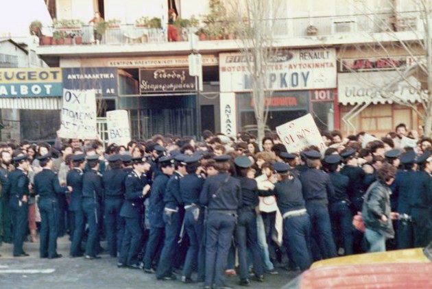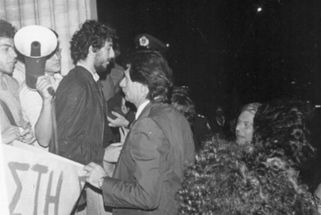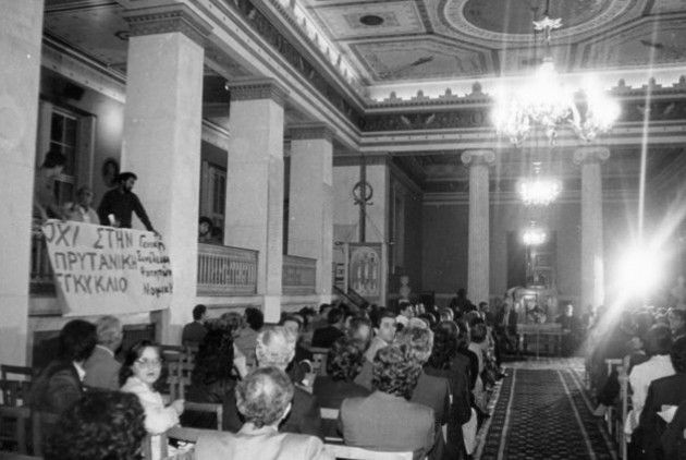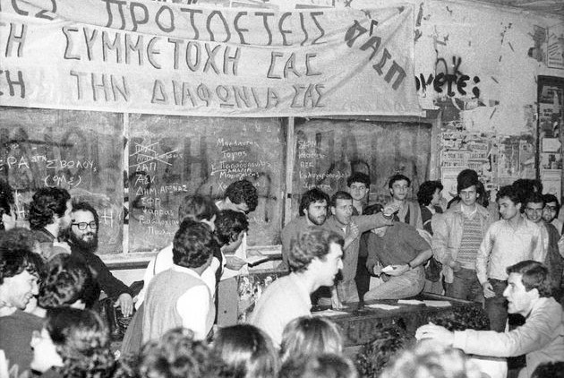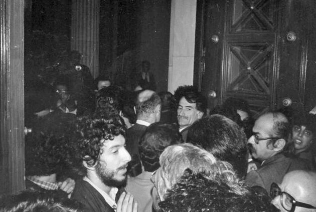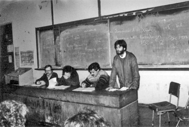 Στην πρώτη γραμμή του μπλοκ των καταληψιών, δεύτερος από δεξιά, διακρίνεται ο Γιώργος Χουλιαράκης, μέλος τότε των Αριστερών Συσπειρώσεων στο Οικονομικό της Νομικής (φωτογραφία 1).