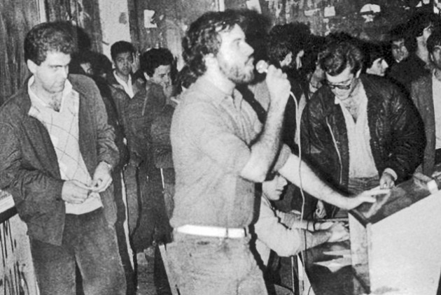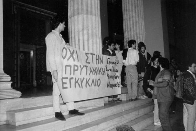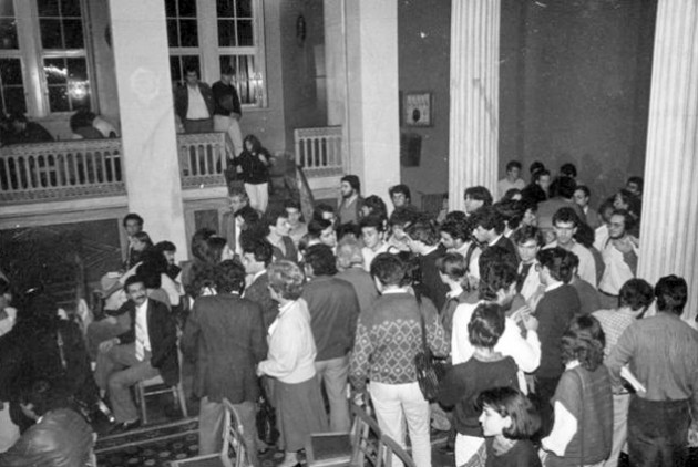 ■ ΤΕΛΗ ΝΟΕΜΒΡΙΟΥ 1984. Γενική συνέλευση των φοιτητών του Νομικού. Ημερήσια διάταξη ρουτίνας, γραπτά ίχνη της οποίας στάθηκε αδύνατο να εντοπιστούν· σε γενικές πάντως γραμμές, οι κινητοποιήσεις εκείνου του φθινοπώρου πρόβαλλαν πρωτίστως οικονομικά αιτήματα, όπως η αύξηση της τιμής του «κουπονιού» με το οποίο διατρέφονταν οι «άποροι» φοιτητές (ακριβέστερα: όσων οι γονείς δήλωναν λίγα στην Εφορία – τα παιδιά των δημοσίων υπαλλήλων θεωρούνταν κατά κανόνα υπερβολικά εύπορα γι’ αυτές τις παροχές, σε αντίθεση μ’ εκείνα των δικηγόρων, των γιατρών και των πάσης φύσης εμπόρων).